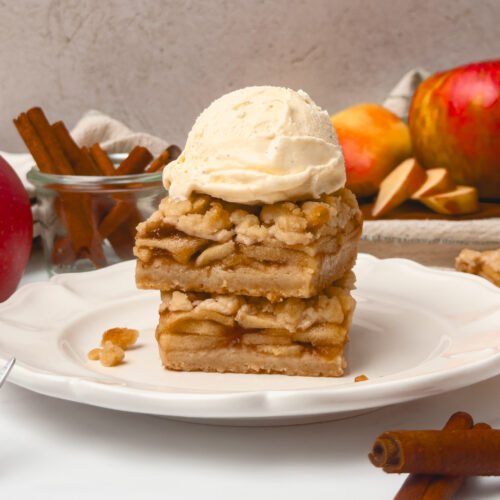 Apple Pie Bars are pretty versatile, so they can be served at room temperature, chilled from the fridge, or, my favorite option, warm with a scoop of vanilla ice cream!