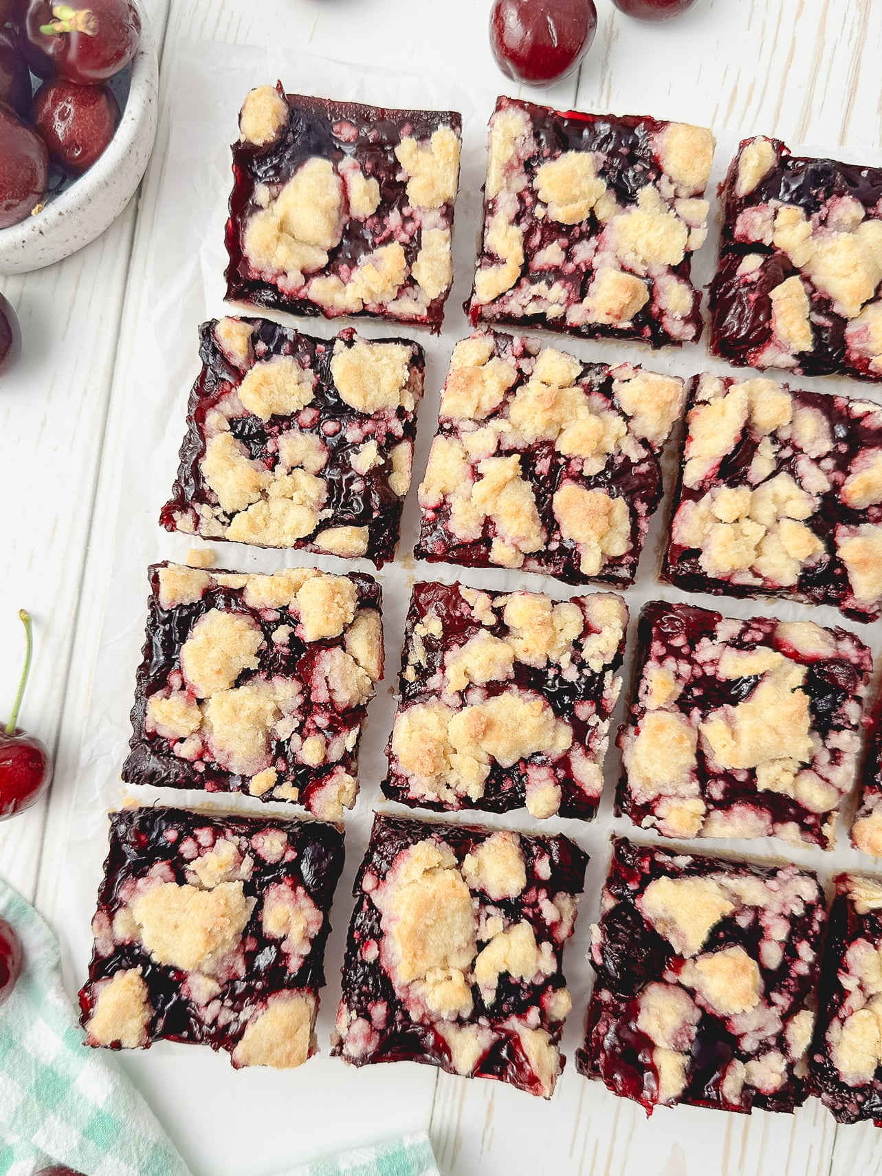 Cherry Crumb Bars should be stored in an airtight container either at room temperature for up to 3 days or in the fridge, for up to 5 days. They can also be frozen in an airtight container, for up to 3 months. Allow the bars to thaw in the fridge for several hours before serving. If storing in layers, use parchment paper in between so they don’t stick together.