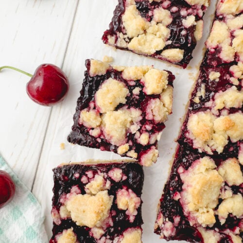 Cherry Crumb Bars are made with a buttery shortbread crust, layered with homemade sweet cherry filling, and finished with crumbly shortbread topping. These bars are a simple summer favorite!