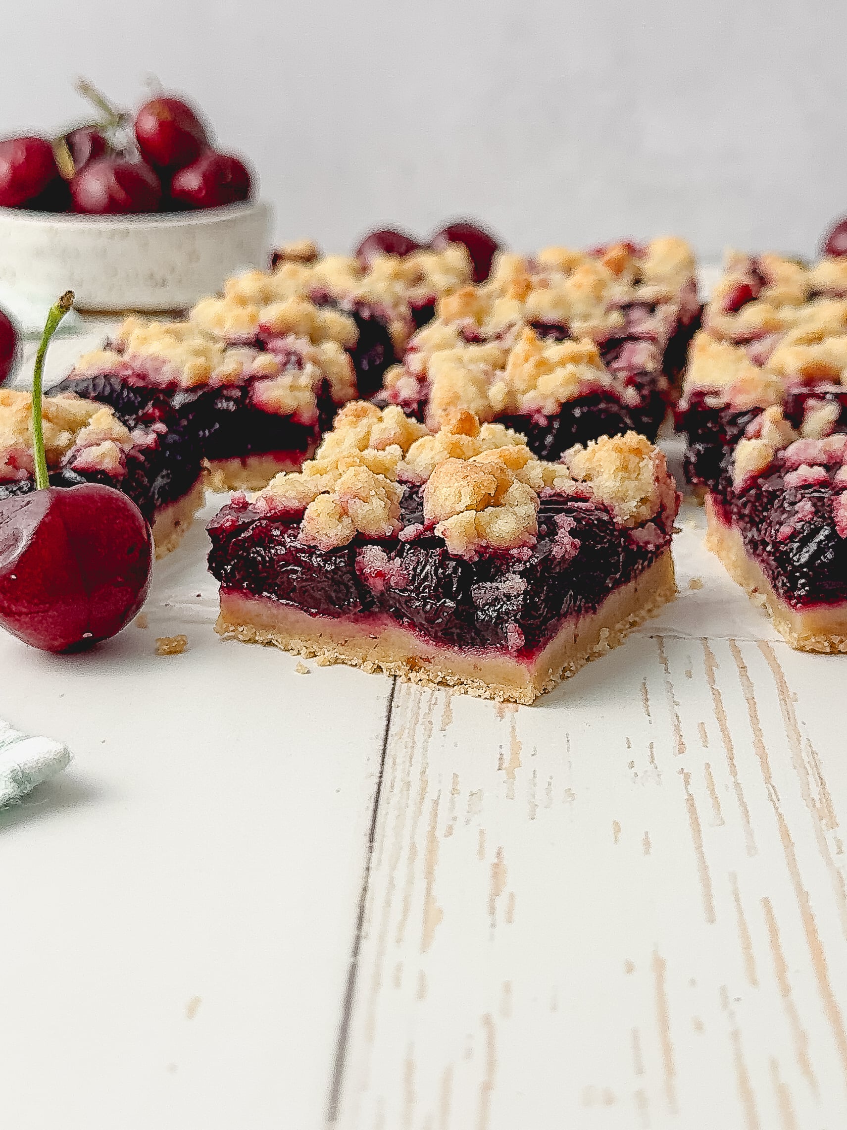Cherry season is here and I’ve been dreaming about making these Cherry Crumb Bars. They start with a buttery, tender shortbread base, layered with luscious homemade cherry compote and more shortbread crumbles on top. Not only are these bars quick and easy to make, but they can be made with fresh or frozen cherries so they can be enjoyed all year long!