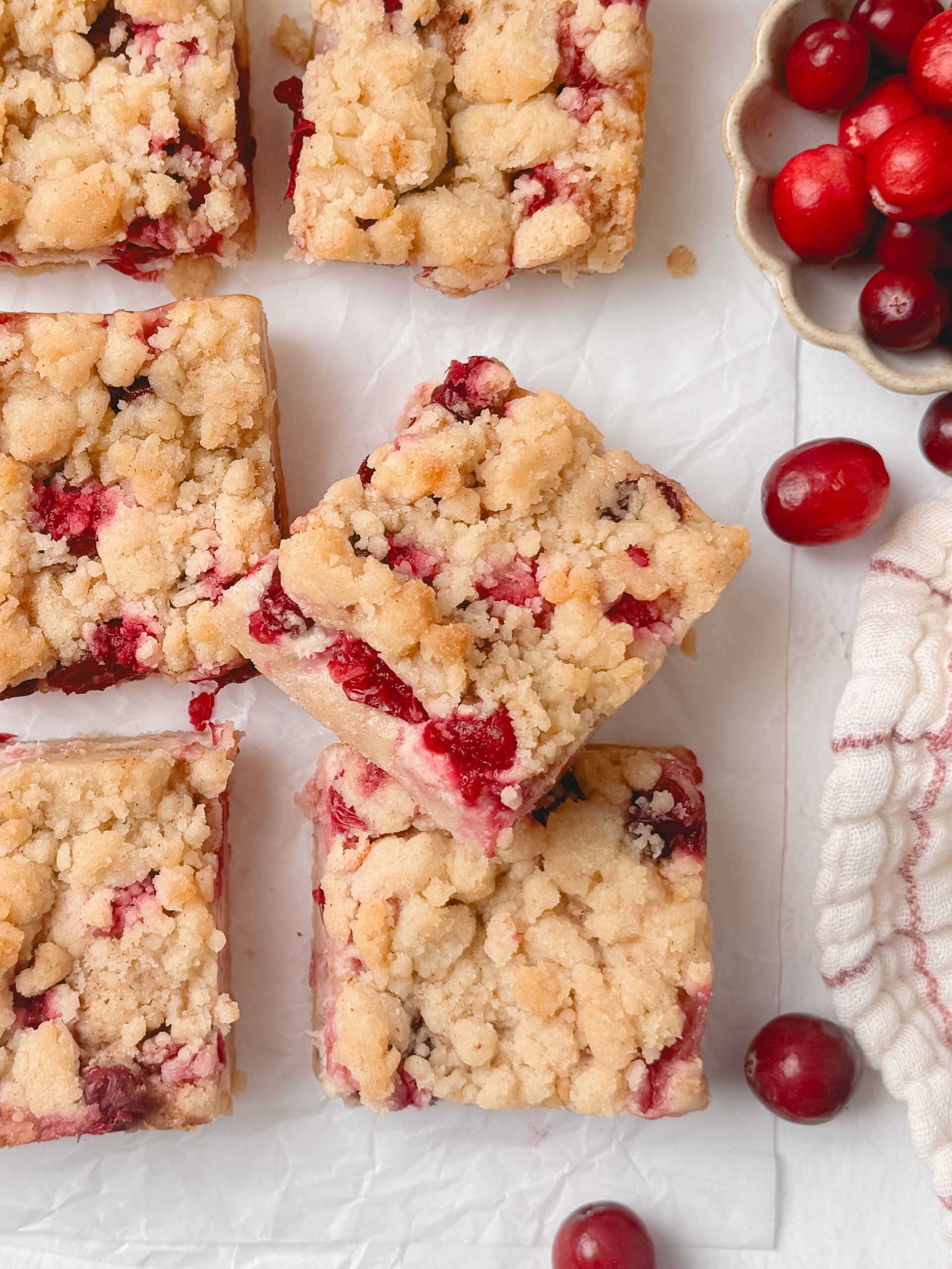 My inspiration for these bars came from my Peaches and Cream Bars recipe. I knew the cheesecake layer and crumble topping would pair well with tart, tangy cranberries. The cranberries and hint of orange add a seasonal touch that makes these bars a perfect cozy winter dessert.