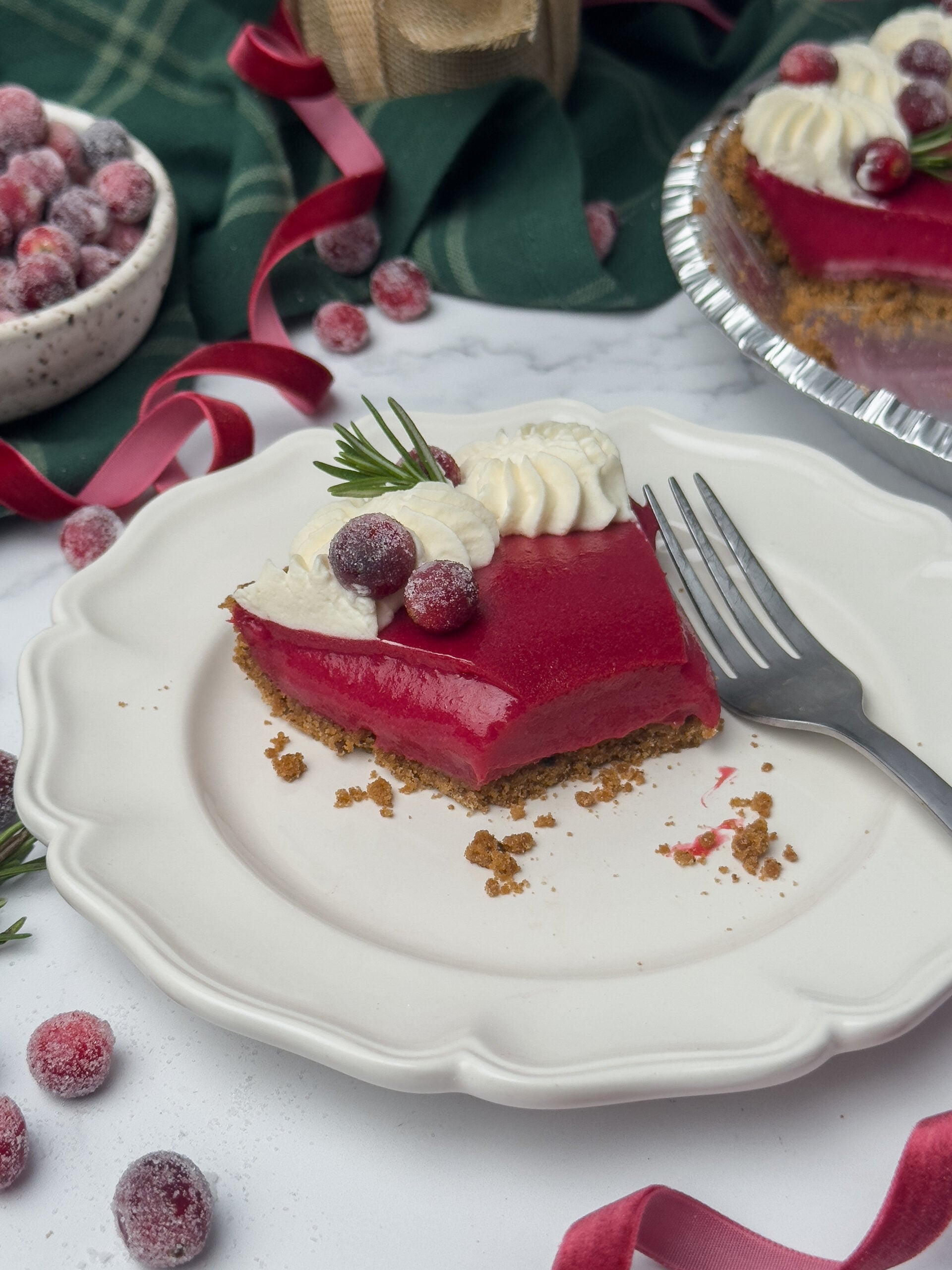 This Cranberry Curd Pie features tart, silky cranberry curd in a crunchy graham crust, topped with fresh whipped cream and sugared cranberries.