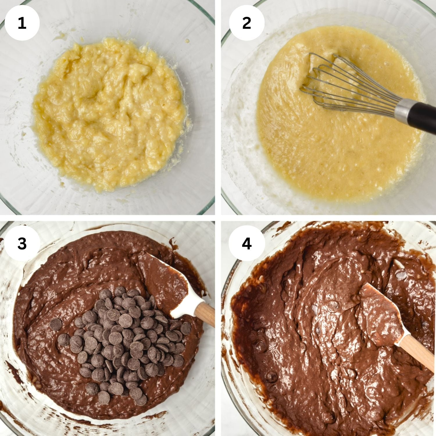 To make the banana bread batter, start by whisking the mashed bananas with melted butter and sugar, followed by the eggs and vanilla. Whisk together the dry ingredients: flour, leaveners, and salt, then mix them, along with the sour cream, into the wet ingredients. Lastly, fold in the chocolate chips with a rubber spatula.