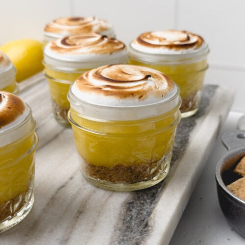These dessert cups are best enjoyed immediately, once they are topped with the meringue and torched. If needed, you can keep them in the fridge for another day or two, but the meringue will start to weep, which makes the cups a bit watery. The lemon curd and graham crumbs can be made in advance, but they will be best when layered right before serving. Store the lemon curd in an airtight container in the fridge, and the graham cracker crumble can be stored in a zip-top bag or an airtight container at room temperature.