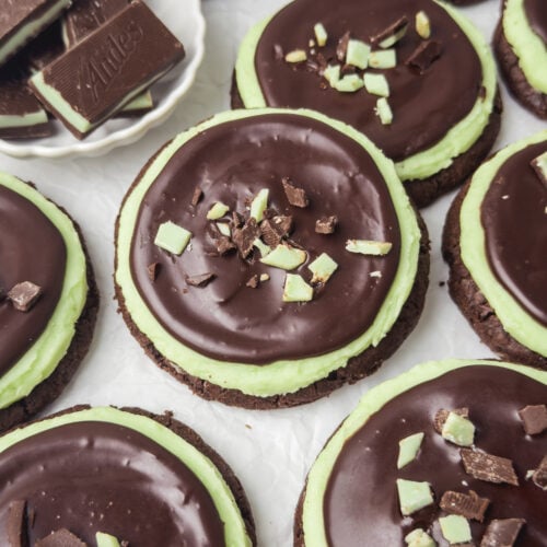 - Assembly: Use a small cookie scoop to add a dollop of frosting to the top of each of the cooled cookies. Use an offset spatula or knife to spread the frosting to the edges and smooth it out flat. Add a smaller scoop of the chocolate ganache on top of the frosting and spread out with an offset spatula or the back of a spoon. Finish the cookies with a sprinkle of chopped Andes mints and enjoy!