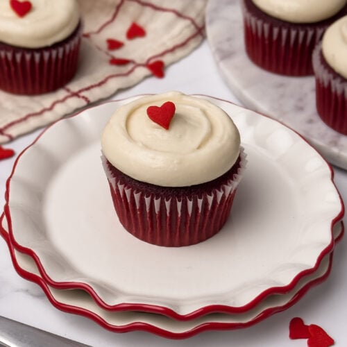 Soft, tender Red Velvet Cupcakes topped with luscious cream cheese frosting. A classic favorite everyone will love!